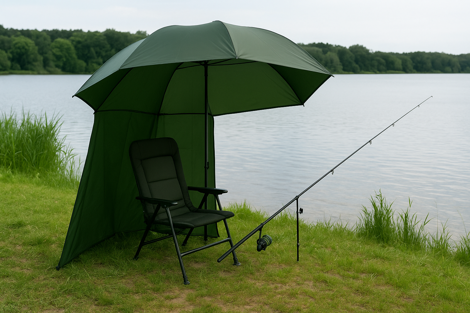 Die Auswahl an Angelschirmen ist groß: Leichte Modelle ohne Seitenteil sind perfekt für kurze Ansitze, da sie kompakt und schnell aufgestellt sind. Ein Angelschirm mit Seitenteil bietet zusätzlichen Schutz vor Wind und seitlich einfallendem Regen, was ihn ideal für längere Sessions macht. Für maximalen Komfort gibt es das Schirmzelt, das fast schon einem kleinen Angelzelt gleicht. Es schützt rundum, ist robust verarbeitet und bietet zusätzlich Platz für Tackle, Ausrüstung und Sitzgelegenheiten.