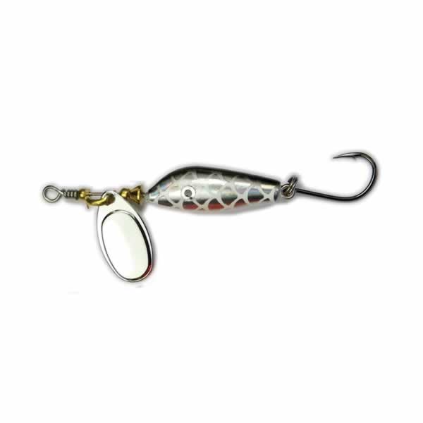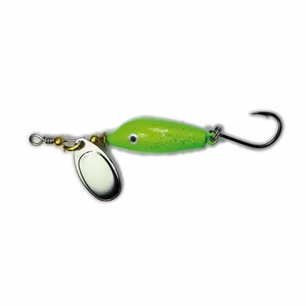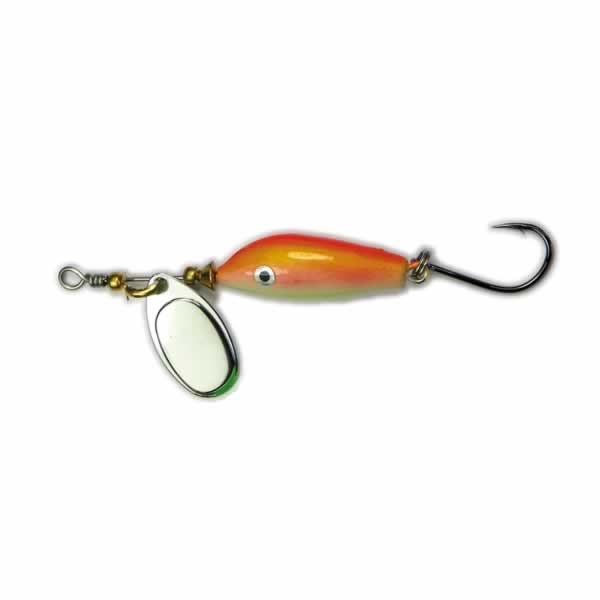 Dank der integrierten Spinnerblatt-Rotation erzeugt der Mini Clip lebhafte Lichtreflexe und Vibrationen, die auch träge Fische aus der Reserve locken. Ausgestattet ist er mit einem superscharfen Mustad-Haken, der selbst bei vorsichtigen Bissen sicher greift.