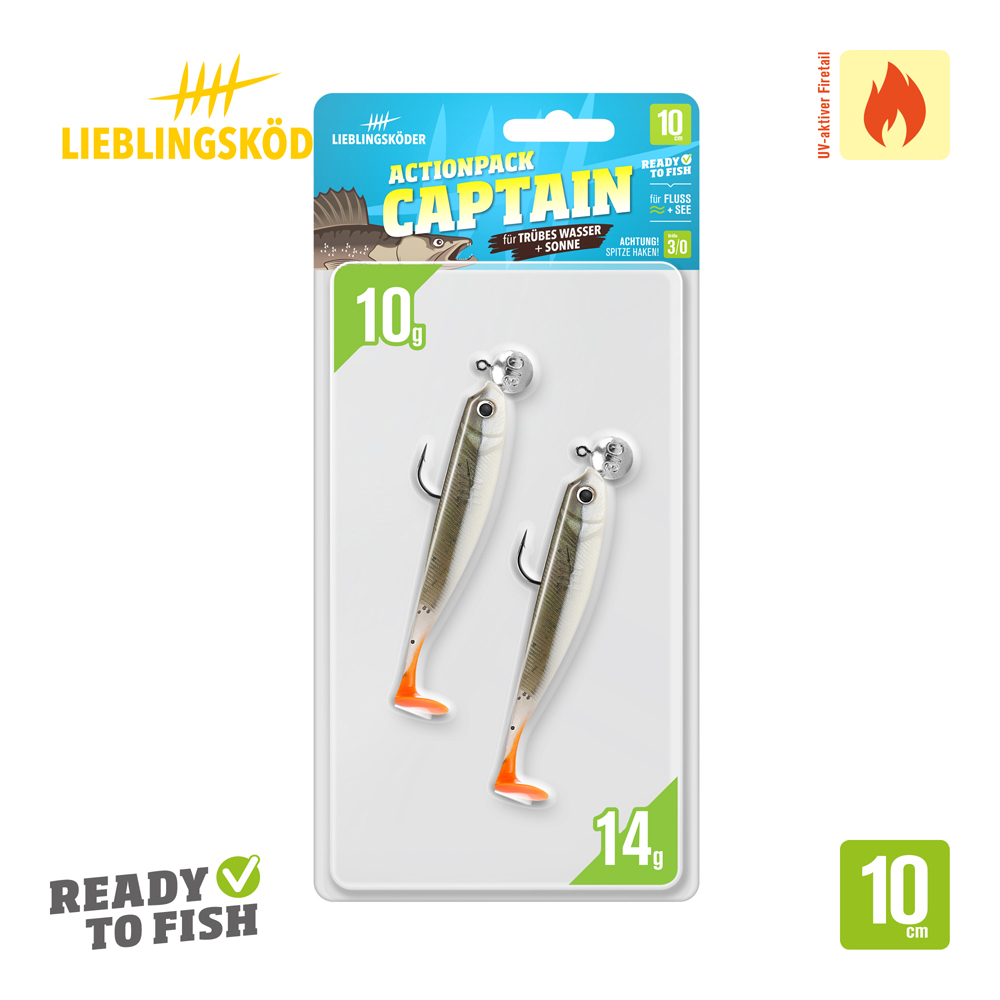 Manchmal braucht man beim Angeln einen schnellen und unkomplizierten Zugang zu den besten Ködern. Unsere Captain Actionpacks sind genau dafür konzipiert. Die zwei Gummiköder sind bereits am passenden Jighaken montiert, sodass Sie sofort mit dem Angeln beginnen können. Die Auswahl der Gewichte ermöglicht es Ihnen, die richtigen Köder für Ihre Angelsituation auszuwählen - der 10g Bleikopf eignet sich hervorragend für stehende Gewässer, während der 14g Bleikopf speziell für fließende Gewässer optimiert ist.
