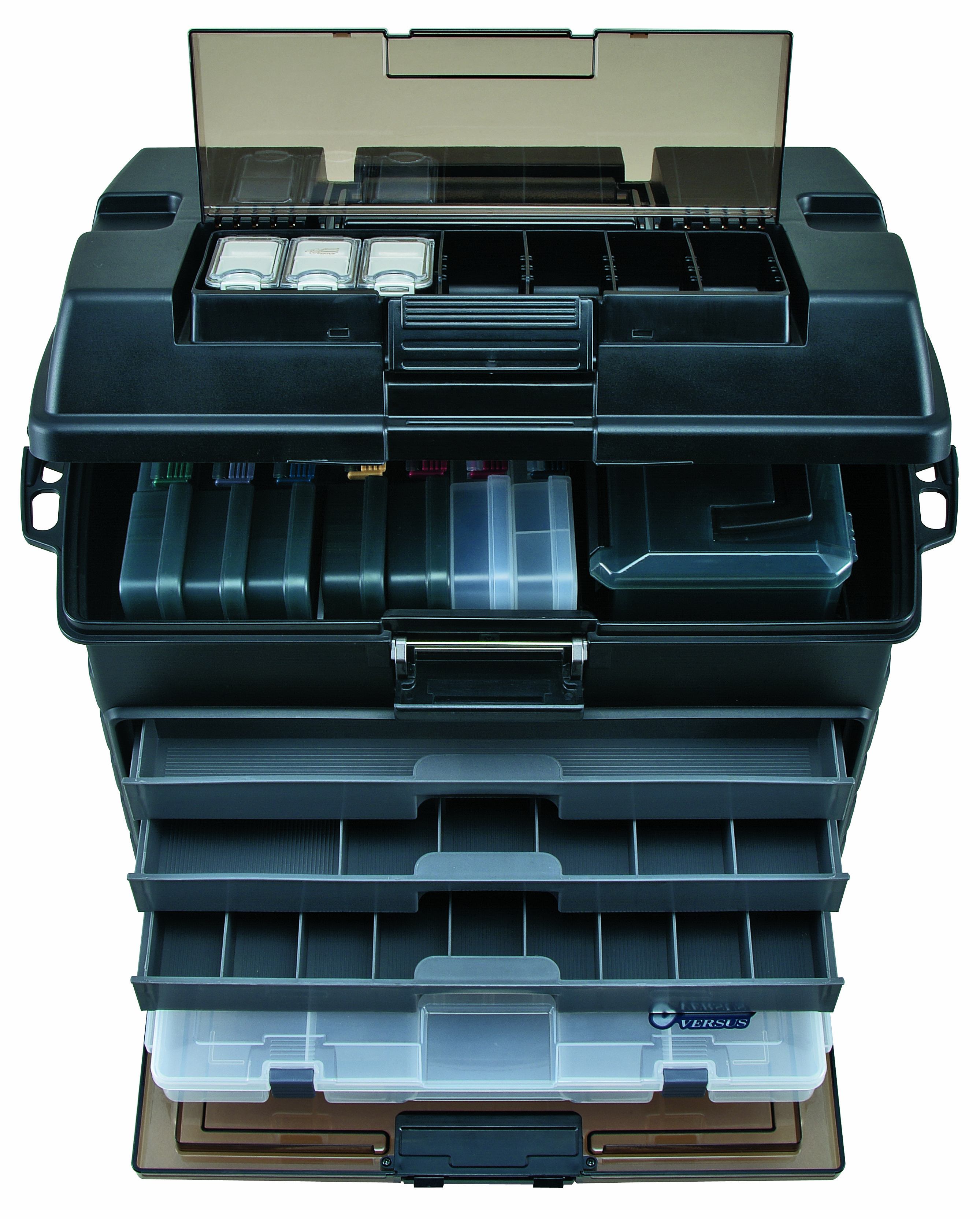 Dieser Bereich eignet sich hervorragend für alles, was Sie schnell greifen müssen, wie Haken, Gewichte oder Köder. Der nächste ist ein größerer Stauraum im Inneren des Gehäuses selbst. Dieser Stauraum eignet sich gut für Ihre größeren Gegenstände oder Angelköder, da er über 7 abnehmbare Trennwände und 4 mit Hakenkerben verfügt, damit Sie Ihre Köder und Rigs aufhängen können. Endlich kommen wir zu den Schubladen. An der Vorderseite des Angelkoffers befinden sich 4 ausziehbare Schubladen, die jeweils mit einer Variation von festen und herausnehmbaren Trennwänden ausgestattet sind, damit Sie Ihre Aufbewahrungsbereiche wirklich individuell gestalten können. Bei all dem verfügt der VS-8050 auch über einen bequemen Tragegriff und mehrere Verschlussriegel, die alle Fächer während des Transports geschlossen halten. Die Schubladen des VS-8050 können herausgenommen und durch das VS-3045-Fachgehäuse (separat erhältlich) ersetzt werden.