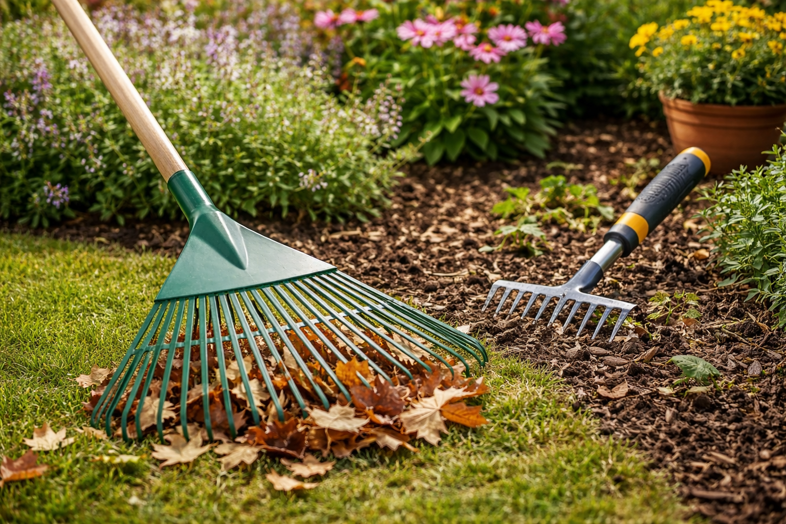Blumen- & Laubrechen – praktische Gartenwerkzeuge für Beetpflege, Laub und saubere Flächen
