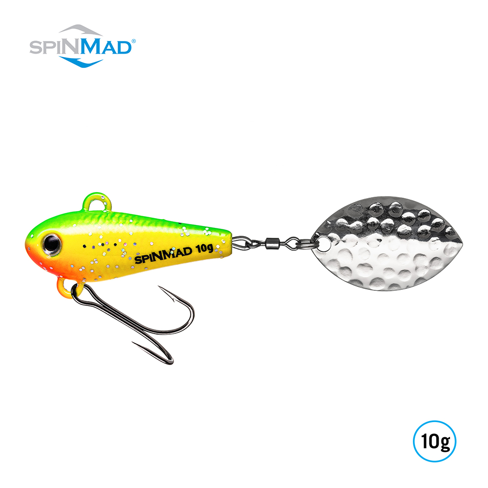 Der SpinMad Originals Green Lemon überzeugt nicht nur durch sein ansprechendes Design, sondern auch durch eine herausragende Verarbeitung. Die großen, auffälligen Augen des Köders locken neugierige Räuber an und fungieren als Angriffspunkt. Der scharfe Doppelhaken der Größe 8 sorgt dafür, dass sich der Fisch sofort hakt und beim Drill nicht abgeschüttelt werden kann. Das Markenzeichen eines jeden Tailspinners, das Colorado-Spinnerblatt, ist an einem robusten Tönchenwirbel befestigt. Dieses Spinnerblatt erzeugt eine beeindruckende Reflexion, die je nach Wassertiefe und Lichtverhältnissen den entscheidenden Unterschied machen kann.
